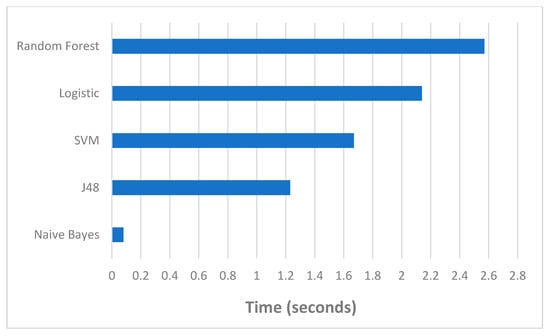 Figure 10 shows the execution time of the various models. We can observe from the figure that Naive Bayes (NB) is the fastest classifier. The KNN is naturally robust for small k value but it consumes large memory and computation time for training. The same issue with SVM regarding the need for large memory and thus more computation time for training. By filtering out extraneous as well as redundant features from the final features, we can reduce the running time of the learning algorithms significantly, the space complexity and yields a more general classifier []. Therefore, selecting the optimal set of features is necessary to reduce the space and time complexity as well as increase the accuracy or purity of classification [,].