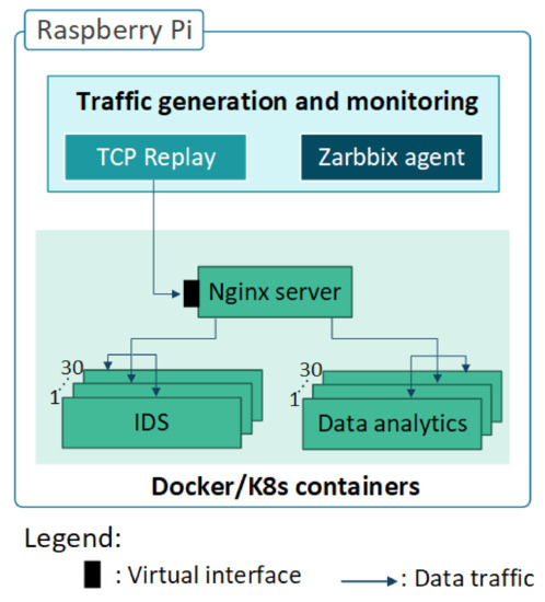 Components of a service container in a Pi board are depicted in Figure 3. Network traffic from TcpReplay is fed into Nginx server container first. Nginx container replicates the same traffic and send it to all available containers in the Pi board. Depending on each experiment, individual or various instance(s) of a service container are deployed in an IoT gateway at a given time. Snort and Firewall containers are representatives of IDS services, where data analytics services are presented by Pytorch, Tensorflow, and Keras containers in our experiments. Network traffic is processed by IDS and data analytics service containers depending on the experiment while Zabbix agent gathers performance data. Containers of each service are increased in each experiment, till 30, and for each iteration of the experiment, performance metrics are monitored and logged.