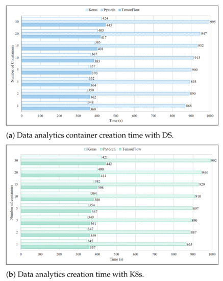 Data analytics services experiments were done with TensorFlow, Pytorch and Keras, and Figure 5a shows their creation time when deployed in three Pi boards with DS. In comparison to IDS service results, data analytics services took a lot more time for creation because of the larger image files. Pytorch was an exception among these services as it had extraordinarily long creation time due to the same reason. However, similar patterns could be traced in the IDS services and data analytic services creation time. The same image files and experiment settings were used to measure the K8s performance in Figure 5b. As expected K8s showed slightly better performance than DS which was consistent with the performance in case of IDS service containers. It can be deduced from the results that increase in the image file size linearly increased the creation time. This experiment results indicated the crucial role that creation time plays in timely scaling of service container.