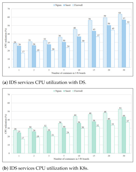Mean CPU utilization of IDS services for three Pi boards while using DS is shown in Figure 6a, where utilization consistently increases with increasing IDS service container instances. Mean CPU utilization of 30 service containers, deployed across three Pi boards, is 63.6% for Nginx, 56.8% for Snort, and 52.1% for Firewall. It is recorded that in one Pi board CPU utilization increments 15.3% with addition of five more containers. If this pattern is extrapolated, a Pi board becomes overloaded with 67.3% utilization when five more container instances are added. Other IDS services follow the similar pattern, and from this it can be inferred that instances of IDS service containers can go up to 10 in IoT gateway for the usual utilization threshold of 65%. Mean CPU utilization results for IDS services with K8s on three Pi boards, in Figure 6b, show a similar pattern but improved performance. The mean CPU utilization for Nginx is 52.63%, for Snort it is 43.51% and for Firewall it is 37.02%. Comparing it against the DS Nginx uses 10.94% less, Snort uses 13.26% less, and firewall uses 15.09% less. Based on these K8s results, it can be inferred that containers of more than 20 services can operate on each board without overload.
