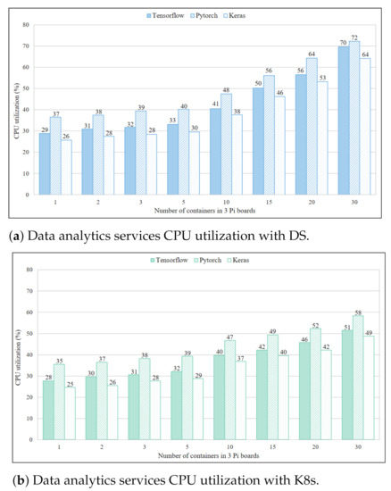 As presented in Figure 7a, CPU utilization of DS based data analytic service containers was only slightly higher in comparison to IDS services despite the high creation time due to the size of image files. The general notion of data analytic services being computationally too expensive for resource constrained devices was negated by these results. The CPU utilization values in Figure 7b for TensorFlow, Pytorch and Keras with 10 containers in a single Pi board (overall 30) were 69.7%, 72.3% and 64.3%, respectively, and that was over the utilization threshold of 65%. This indicated that to avoid overloading in IoT gateway only five to seven data analytic service containers should operate simultaneously. Similar to the case of IDS services, K8s showed better CPU utilization than DS in Figure 7b. The CPU utilization values for TensorFlow, Pytorch and Keras with 10 containers in a Pi board are 51.48%, 58.29% and 48.79%, respectively. Based on these results, it can be inferred that by using K8s containers more than 10 services could operate on each board without overloading.
