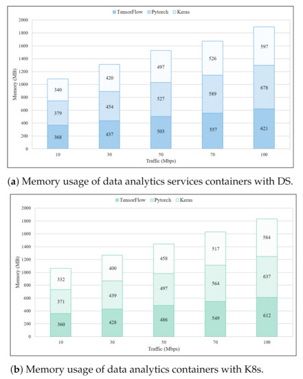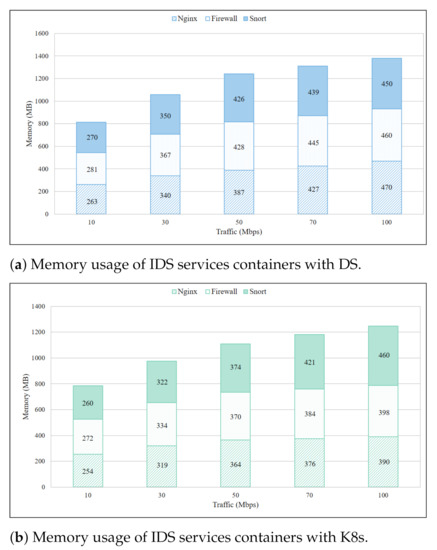 Memory consumption of data analytic services is higher than IDS services for both DS and K8s, as shown in Figure 9a,b, respectively. Results of both DS and K8s also revealed an even distribution of memory usage among different containerized services, irrespective of the service types. K8s showed on average MB less memory consumption than DS, which could be crucial in extremely resource constrained IoT systems. A more crucial observation from these experiments was that for merely 100 Mbps traffic the memory consumption by each service container was quite substantial. With multiple active service containers under high traffic this could cause disruption in IoT gateway operations and severely degrade QoS. To avoid this from happening a comprehensive monitoring system was required which triggered auto scaling of services once the defined threshold was reached.