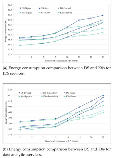 Energy consumption comparison between DS and K8s for IDS services containers is shown in the Figure 10a. Increment pattern of energy consumption for all three IDS services, Nginx, Snort, and Firewall was almost similar when deployed with DS, where Nginx consumed the most energy 61 kJ with 10 containers in a single Pi board. Energy consumption of same services with K8s was similar to DS till there are three containers in a single Pi board (overall 10), from this point increment in energy consumption with addition of more containers was reduced. With 10 containers in a Pi board (overall 30), Nginx, Snort, and Firewall service containers with K8 showed 1.15%, 1.49%, and 1.67% less energy consumption than DS, respectively. For reference a smart phone in an idle state consumes kJ energy in 10 h [45]. This makes K8s much more energy efficient than DS for IDS services.