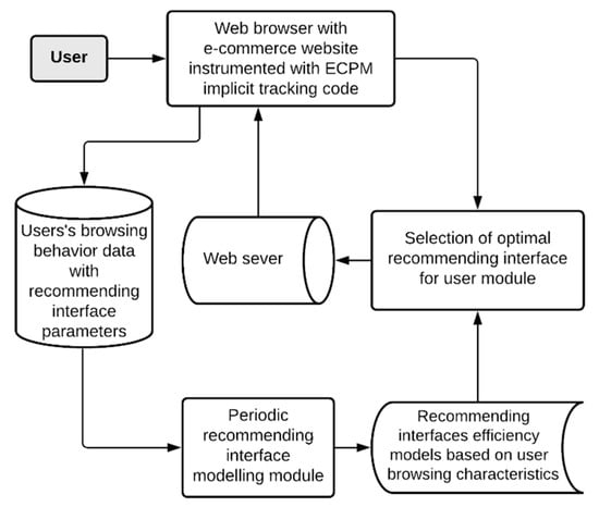 Our e-commerce customer preference monitor (ECPM) was built in order to collect e-customer behavior data []. This monitoring tool was implemented as an extension for the Mozilla Firefox browser, with the core monitoring code being easily detachable and available for external use. ECPM allows for monitoring of human–website interaction by exploiting document object model (DOM) events. HTML document object model events allow JavaScript to register different event handlers on elements in an HTML document. Our ECPM unobtrusively collects data on visited product pages and user interactions, recording numerous parameters describing the page’s physical attributes and interactions. Among many collected parameters connected with the recommending interfaces were times of mouse cursor spent inside recommendation zones and their physical size measured as the number of characters within recommended products section. As other research shows, mouse position may be quite strongly correlated with eye gaze [,,]. Tracking mouse movements can be used as a lower-quality and easier to perform alternative to eye tracking for the purpose of identification of user interest. Measured times with cursor being over recommended products were related to other measures such as total time spent on the product page and page height and length measured by a number of characters, images, etc. In this way, relative measures of cursor times spent inside particular recommendation interfaces were generated.
