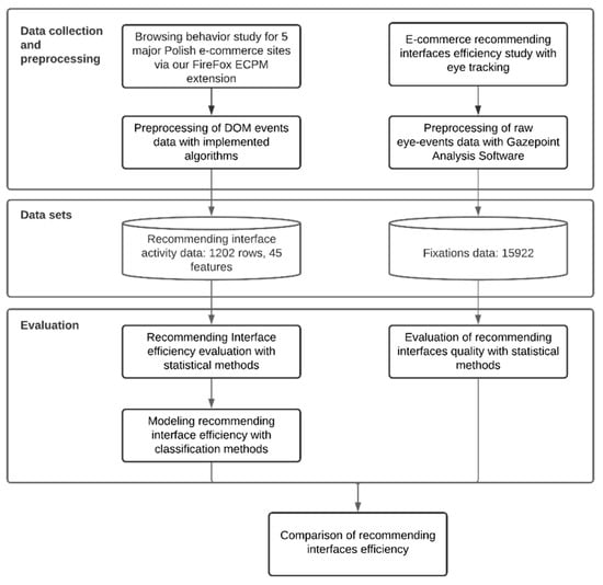 The research experiment procedure is presented in Figure 2. Results presented in this paper are based on two experiments on recommending interfaces in e-commerce websites, described in detail in the next two sections, one performed with eye-tracking equipment and software on a smaller group of participants, and the other performed using our own implicit browsing behavior monitoring tool in the form of a web browser extension—on a larger group of participants. Both experiments used simple e-commerce scenarios where participants were browsing products and expressing interest in them. The main goal was to analyze recommending interface efficiency for two groups of users with different ways of collecting data about users’ activity. Results from both methods have been cross-compared in order to estimate their applicability for automatic recommending interface personalization in e-commerce scenarios, but not limited to them.