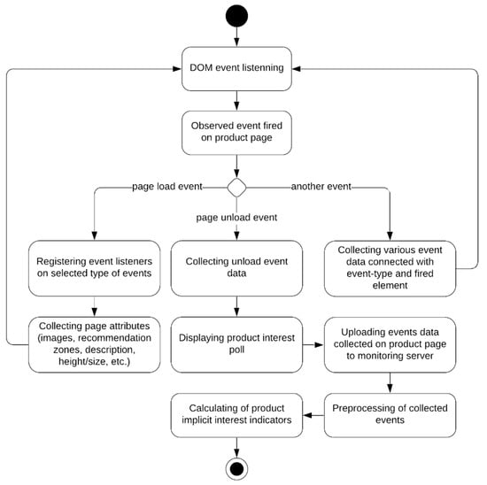 Another possible technique for implicit monitoring of user behavior on websites is based on human–computer interaction monitoring solutions such as scripts or browser extensions that allow registering events resulting from interacting with the website on the client’s side. With this method, it is possible to observe user behavior unobtrusively without extra attention from them [] or additional equipment.