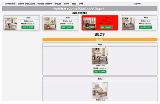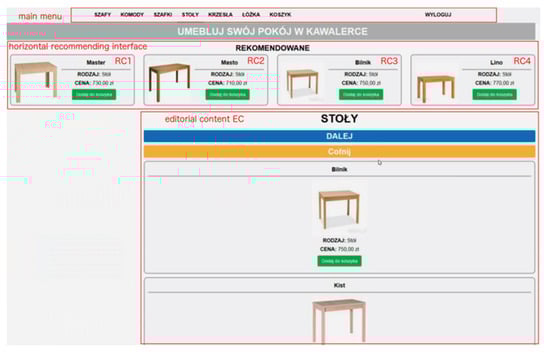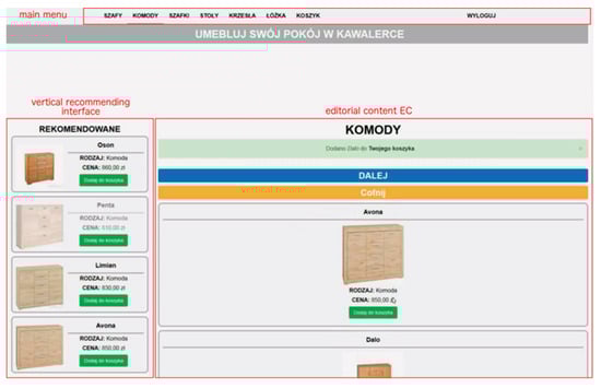The study design was within subjects. All participants were given the same task—to shop online to furnish a studio apartment with six kinds of furniture fully. A subject was asked to go from one product category to another and choose an item from each category. For the purpose of the experiment, a dedicated e-commerce website was developed using Drupal CMS. The website was composed of a recommending interface. Each participant was provided with the same website and the same product sets. The pages were written in Polish and consisted of the title, menu, product images, and descriptive text. The website covered functions such as product list, buying cart, and recommendations.