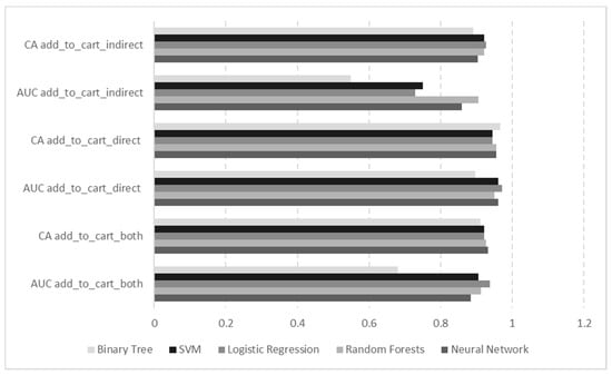 As a measure of recommendation efficiency add-to-cart actions were used, being the most appropriate due to the selection and purchase task given to participants. The pre-processed data from the eye-tracking study were used for building classification models using five different modeling methods—logistic regression, decision trees, random forests, neural networks, and support vector machines. Those methods were selected as being commonly used and well established [,]. Our goal was to compare those methods in terms of classification quality in order to select the most suited one for the task of evaluating recommending interfaces.