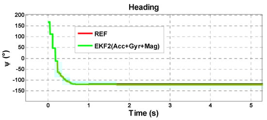 Figure 6, which considers the first 300 s of the test, shows that the heading angles converge to the heading reference at 187° after the fine alignment and the transition from fine alignment to the attitude estimation process is automatic. The initial transients generated from the fine alignment are depicted in