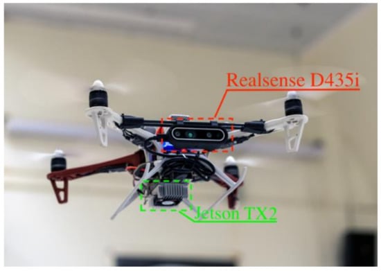For visual inspection purposes, the UAV requires sensors to stabilize and navigate the vehicle itself and detect target devices. We assembled a UAV system equipped with an Intel RealSense D435i stereo camera and a Jetson TX2 onboard computer. The hardware platform of our quadrotor system is shown in Figure 1.
