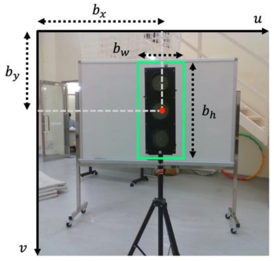 where and are the center coordinates, and the width and height of the predicted bounding box, respectively, and is the sigmoid function applied to constrain the offset range between 0 and 1. Figure 3 shows an illustration of the bounding box predicted by YOLO.
