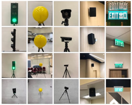 A series of sample devices, including traffic light, bulb, exit sign, amplifier, and closed-circuit television (CCTV), were adopted as target devices in the experiments to simulate the inspection targets. We prepared a customized medium-scale dataset, including around 20,000 images in total, which was composed of 2000 images per class as well as 10,000 empty background images. The dataset contains images with different illumination conditions, view angles, distances from objects, scales, and resolutions, as shown in Figure 4. All images were captured on the campus of the Hong Kong Polytechnic University. The training result will be further detailed in Section 6.1.