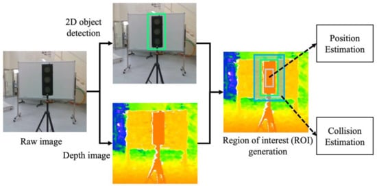 Followed by object detection, the region of interest (ROI) generation involves segmenting the proper region for 3-D object position estimation and collision estimation. The input of ROI generation is the aligned depth image and RGB image with the same resolution of 640 × 480. Then, RGB images are used for object detection to predict 2-D bounding boxes in each frame. Considering that the 2-D bounding box may include background pixels, we did not directly utilize object regions in depth images; we used two scaled regions in the depth image to represent the spatial information of object and background separately.