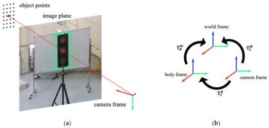 where is the transformation representing the pose of the body frame with respect to the world frame provided by the localization module, and is the transformation from the camera frame to the body frame. The coordinate frame relationship is illustrated in Figure 6b. Then, the 3-D object position can be estimated by the mean value of all object points in the same ROI (Figure 6a).