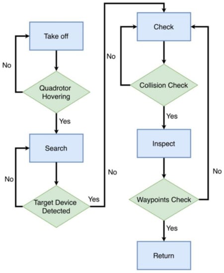 - Check: In this mode, the quadrotor heads to the target and approaches the target device by flying to the waypoint. After the quadrotor reaches the waypoint, it is commanded to reach a hover state and check the collision status of the target described in Section 4.3.3. If the UAV status is safe, the state machine is switched to Inspect mode.