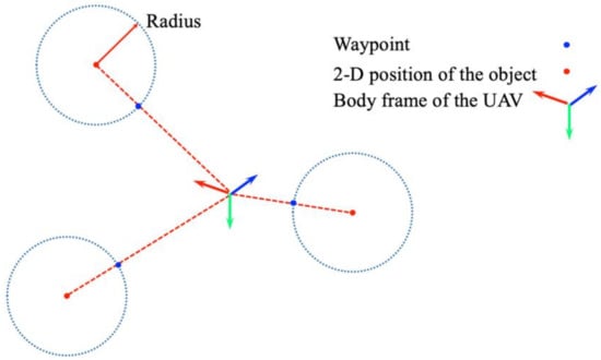 To generate a sequence of waypoints for the quadrotor, we consider a two-pronged problem. Generally, aerial photography is necessary for inspection. Therefore, the camera’s optical axis needs to focus on a specific device. As described in the previous section, the circle trajectory is predefined for the UAV to follow. In addition, there are multiple devices. The sequential order when visiting each target device needs to be determined. As such, a geometry method is adopted to generate waypoints for the UAV, connecting the starting point and the target point. Algorithm 2 describes the process of searching for waypoints. To begin, our algorithm is initialized with an empty set The UAV position is considered as a 2-D point . When the 3-D position of the target device is obtained by perception, the corresponding 2-D position is represented as . Then, the detected target is represented by a circle with two properties: the 2-D location and the radius . The intersect() function generates a ray from to and returns to the ray’s intersection point on ’s circle. After one iteration finishes, the sequence of waypoints is sorted from the shorter one to the farther one by the sort() function according to the Euclidean distance between the 3-D object position and the UAV position. Figure 8 provides an illustration of the waypoint generation algorithm.