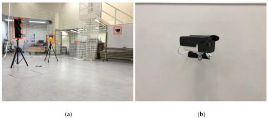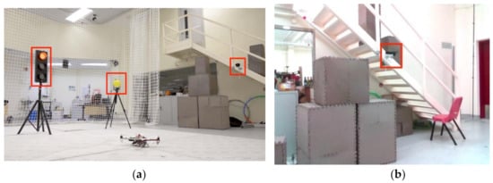 Images of the experiments conducted in the indoor environment. (a) Three objects, including a traffic light, a bulb, and a CCTV for inspection mission are marked with red rectangles. (b) The target device CCTV is shown outside of the range of the motion capture system.