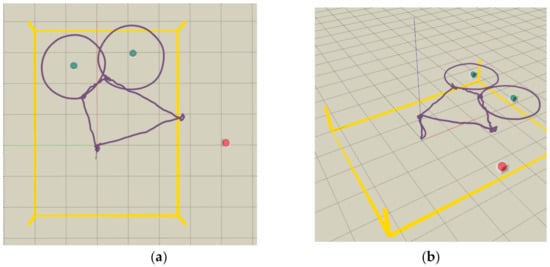 Flight trajectory visualized in RVIZ, shown as the purple curve. The collision status is shown as the red or green sphere, and the boundary of the test site (4.6 × 6.0 m) is shown as yellow lines. (a) Bird view (b) Side view.