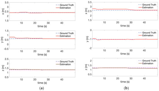 A more specific quantitative evaluation of the 3-D object position estimation is presented using the root mean square error (RMSE) in Table 3. The RMSE is below 0.1 m in all directions. The very low error is partly due to using the ground truth vehicle pose as the input in the object position estimation []. Therefore, we reach the conclusion that our proposed method provides an accurate estimate of the target device position and performs an acceptable result, that we can move to visual-inertial odometry experiments.
