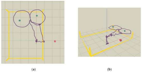 Flight trajectory visualized in RVIZ with the same definitions for the colors used as in Figure 10. (a) Bird view, (b) Side view.