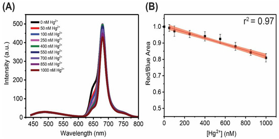 Results of a FG-CD quenching assay with mercury (II) ions showing (A) the fluorescence spectra with changes in the 650 and 680 nm peak, while the 485 nm peak remains unaffected by the presence of mercury (II) cations and (B) the linear plot of the decreasing overall R/B area ratio showing a ~20% decrease in red fluorescence with an r2 = 0.97.