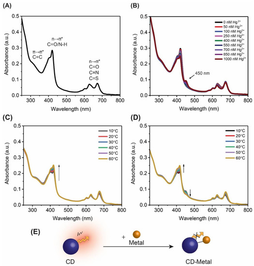 Absorbance spectra for FG-CDs (A) alone, (B) showing a new peak at ~450 nm in the presence of Hg2+. Absorbance spectra of FG-CDs showing changes as a function of increasing temperatures (C) with 0 nM of Hg2+ and (D) with 1000 nM of Hg2+. (E) Graphical illustration of CD fluorescence quenching upon binding to a metallic cation.