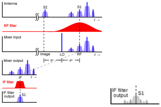 Figure 2 shows how S1, which is the desired frequency, is processed with other incoming signals which need to be filtered like S2 (1st graph). These filtering processes are shown in both the second and fifth graphics. For example, the RF filter (2nd graph) removes any signal such as S2 at the image frequency local oscillator (LO)—intermediate frequency (IF). The remaining signal is applied to the mixer which implements a CORDIC processor where a sine or cosine wave with a frequency oscillator (3rd graph) is added.