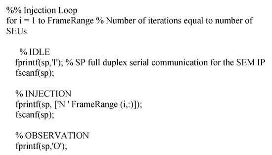 In order to automate the fault injection process, a Matlab script is used for this purpose (Figure 26). The input for the script is the FrameRange file, with all the information about sensitive bits in terms of configuration memory addresses. Each one of the injections (one per address) are sent to the SEM IP controller through the monitor interface as is showed.