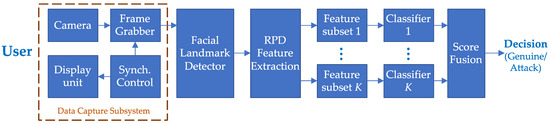 Figure 1 shows a block diagram describing the main components of the proposed system. A graphical stimulus on a visual display explicitly directs the eye movements of the user and the camera (sensor) which captures a series of facial images during this process. For the experiments reported in the following section, the visual stimulus was a cross shape moving along a set of randomly generated paths at uniform speed. The system extracts facial landmarks from the captured frames. These landmarks, such as eye corners, are then used to compute various features, which are then used to detect whether a presentation attack, using an attack artefact, has been attempted.
