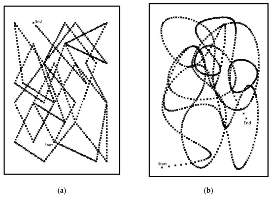 Samples of the random trajectory used as a challenge during the data collection: (a) Lines; and (b) Curves (the labels’ “start” and “end” are added for the clarity of illustration only).