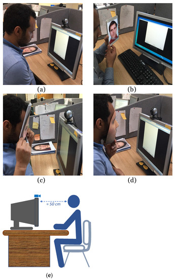 Eighty adult male and female participants from a range of ethnic backgrounds were recruited to evaluate the proposed system while acting as both genuine users and impostors. The number of participants was similar to that used in other published work in the presentation attack detection and should be sufficient to illustrate the potential of the proposed approach. Figure 4 illustrates the hardware setup for data acquisition as well as snapshots of user attempts (both genuine and impostor attacks). Figure 4a is an example of a genuine attempt, Figure 4b shows projected photo attack, and Figure 4c,d show 2D mask and 3D mask attacks, respectively.