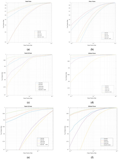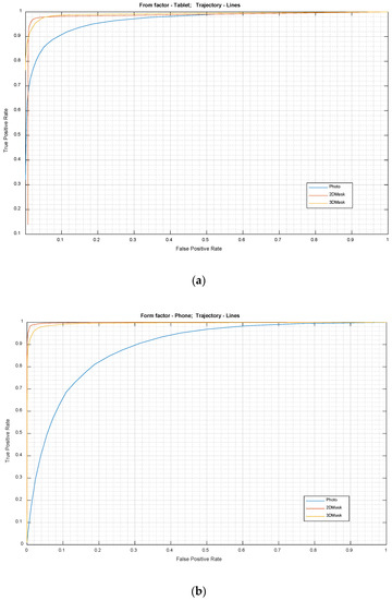 ROC curves for the photo, 2D mask and 3D mask. Stimulus trajectory: Lines. Form factors: (a) tablet format; and (b) phone format.