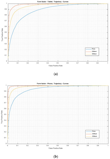 ROC curves for the photo, 2D mask and 3D mask. Stimulus trajectory: Curves. Form factors: (a) tablet format; and (b) phone format.