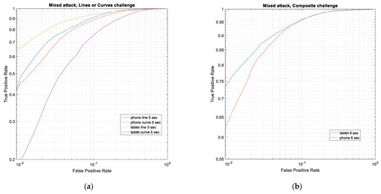 ROC curves for mixed attack types for both device formats. Stimulus trajectory: (a) Lines or Curves challenge for 5 s; (b) composite challenge for 6 s.