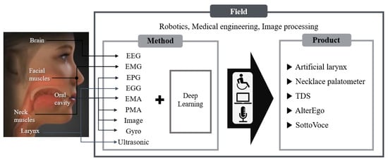 As shown in Figure 11, efficient sensors, such as, are developed and used for speech recognition, and if applied to wearable devices, they can also be applied to various services via deep learning models. Microelectromechanical systems (MEMS) technology is expected to improve performance and mobility, as it can be improved by implementing accelerometers, gyroscopes, pressure sensors, actuators, and signal processing ICs in one-micron size. It can be used by people with voice disorders. However, when speech signals can be obtained at the nerve level using non-invasive BCI devices such as imagined speech or inner speech [], it is much more difficult to infer the meaning than to recognize speech through muscle movement. Improving speech recognition rates by enhancing a number of these possible problems is a future research challenge.