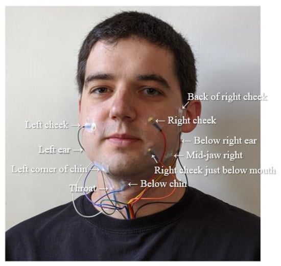 Early studies of the EMG-based speech recognition goes back to 1985, with the system developed for revealing five Japanese vowels in real-time []. In this early study, the accuracy of word recognition was only 60%. However, more research has been carried out onwards. In 2011, Schultz [] recognized plosive and fricative noises in the input voice. Then, she proposed a coarticulation modelling for the word recognition by selecting a trained classification based on those noises. They, in turn, proposed modelling to reduce the natural language error rate of 101 words by up to 10%. In 2003, a word recognition using the shape of the mouth for vocal dysfunction has been continuously studied [], but it has not been successful []. In 2010, Janke carried out the word recognition by using the spectral mapping method but it is failed recognizing words with only 53% of accuracy. Then, in 2014, Srisuwan [] used the moving average filter and stacking filter as the word recognition method improved the accuracy of 11 words by 78%. However, there is an extra for use in a smaller number of words. Currently, research on word recognition using EMG signals for various languages such as Thai, Chinese, and English is progressing [,,]. Figure 3 shows the positions for electrodes on a face [].
