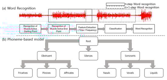 More recently, a study on real-time speech conversion system using EMG signal was also conducted []. In addition, there are studies that have improved the accessibility of data collection by using a patch electrode different from the electrode used in the past []. Pattern recognition and machine learning tools are used in signal processing for word recognition. EMG signals are obtained from the facial and neck muscles. In order to recognize isolated words and the tones of the word, speech-related features in time domain and frequency domain are extracted, and after that, the classifier is used to recognize words and tones []. In the process, the algorithms were developed by evolving speech recognition models: for recognizing sequences of words using grammar models, and finally for recognizing a vocabulary of previously untrained words using phoneme-based models []. Figure 4 shows an example of word recognition using the EMG signal.