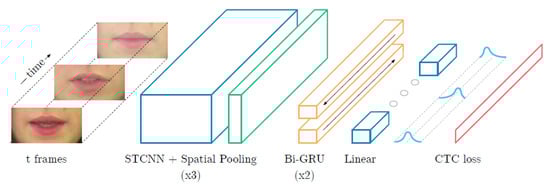 LipNet [] is a lip-reading system developed by DeepMind Team, a Google artificial intelligence development company (London, UK), and researchers at Oxford University in the UK. LipNet is an end-to-end sentence-level lip-reading model, which predicts the full-sentence sequence of what lips of the person pronouncing the sentence when they see the shapes of the movements and informs the results in text. The architecture of the LipNet is shown in Figure 8, it is characterized as the first model designed to simultaneously learn spatial-visual features and sequence models. When the features are extracted through the spatiotemporal convolutional neural networks (STCNN) with the sequence of the video frame initially as input, the results are processed using a bidirectional gated recurrent unit (Bi-GRU) for efficient temporal aggregation. Then, after applying a linear transformation for each output, connectionist temporal classification (CTC) is used to train without alignment information between the input data and the label, as a result, the variable-length sequence of video frames is converted to text sequences. In this case, only phonologically important parts of mouth form have been emphasized and qualified using the saliency visualization technology. LipNet, consisting of such neural network architecture, has been tested to demonstrate that it is more recognizable than the lip-reading skill of deaf people when translating the same sentence, but there is a limit to measuring accuracy with specially designed videos with well-trained BBC news cases for testing.