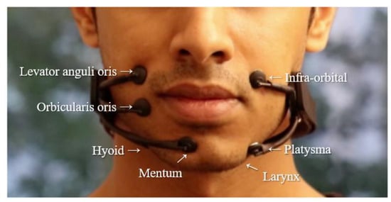 EMG is a technique in which the electrical activity produced by muscles is recorded using electrodes either attached to the skin or inserted into the muscle (Figure 2). Since the usage of surface electrodes offers a non-invasive way of recording, sEMG is generally preferred over the EMG with needle electrodes. sEMG evaluates the muscle’s function by observing the electrical activity that emanates from speech musculature around the region of face and neck. These signals can be used in ASR systems and overcome some limitations by being able to recognize speech in very loud environment [], to be speech interfaces for those with speech disabilities [] and to improve performance by combining acoustic signal [,].