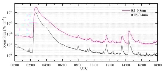 Solar X-ray flux measured by the Geostationary Operational Environmental Satellite (GOES) Solar X-ray Imager during the solar flare that occurred on 13 December 2006. The flare occurred from 02:14 to 02:57 (UTC), and the peak time was 02:40 (UTC). The sampling period was 3 s. The solar X-ray flux data were provided by the National Geophysical Data Center (https://satdat.ngdc.noaa.gov/sem/goes/data/, accessed on 6 January 2021).