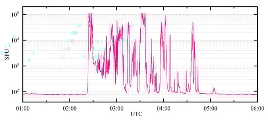 Figure 2 shows the L-band (1415 MHz) solar radio emission power observed at station Sagamore Hill in America during this SRB event. The data were obtained from the radio solar telescope network (RSTN), and the sampling frequency was 1 Hz. This SRB event occurred between 02:20:00 and 04:45:00 (UTC), and the peak flux value reached 1.1 × 105 SFU, which was more than 1000 times of the normal value (<100 SFU).