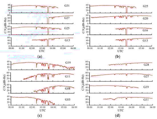 We select stations CEDU and ALIC in Australia as well as stations TWTF and KUNM in China to analyze the influence of the SRB on the on 13 December 2006. The solar elevation angles of the four stations were 80.7°, 84.9°, 42.5° and 36.0°, respectively. Figure 3 shows the decrease in the of different satellites at each station for the GPS L1 frequency. The data were provided by the International GNSS Service (IGS), and the sampling period was 30 s. Figure 3 shows that the of each station decreased to varying degrees during the SRB.