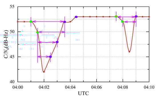 We define the moment at which is higher than that at the next moment as the falling moment. This is denoted as , where is the number of falling moments. The set of falling moments, which is denoted as , can be expressed as . Likewise, the moment at which is higher than that at the previous moment is defined as the rising moment and denoted . For this expression, is the number of rising moments, and the set of rising moments, which is denoted as , can be expressed as . To illustrate the model with an example, the values of G13 at the GPS L2 frequency observed at station CEDU during the SRB event on 13 December 2006 are shown in Figure 4. The green points are the falling moments, while the purple points represent the rising moments.