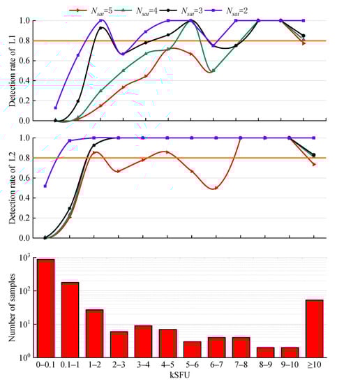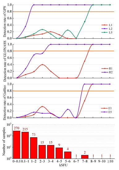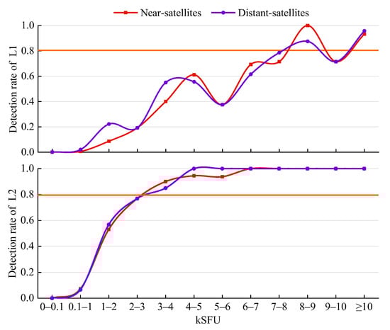 In the case of = 5, only a few flux ranges have a detection rate of 80%. For GPS L1, only 8–9 kSFU and 9–10 kSFU reach 80%; for GPS L2, only 1–2 kSFU, 4–5 kSFU, 7–8 kSFU, 8–9 kSFU, and 9–10 kSFU reach 80%. Overall, the detection rate is quite low in the case of = 5.