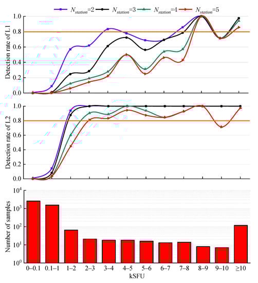 The detection rate at GPS L2 is much higher than that at GPS L1, which is consistent with Figure 5. For GPS L1, there are a small number of flux ranges with a detection rate of 80%. In the case of = 2, only 3–4 kSFU, 7–8 kSFU, 8–9 kSFU, and 10 kSFU have detection rates 80%. However, for GPS L2, in cases of = 2, 3, and 4, the detection thresholds that meet the detection rate of 80% are in the ranges of 1–2 kSFU, 1–2 kSFU, and 2–3 kSFU, respectively. There is a sudden and obvious drop in the range of 9–10 kSFU at both the L1 frequency and L2 frequency. A possible reason for this is that merely 7 samples are in the range of 9–10 kSFU.