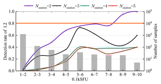 Due to the detection rate at the L2 frequency being higher than that at the L1 frequency, we further divide the range of 0.1–1 kSFU at the L2 frequency for more in-depth analysis. As shown in Figure 7, there is a trend of fewer samples and a higher detection rate with increasing solar radio emission power. In the case of = 3, 4 or 5, there are no flux ranges with detection rates reaching 80%. However, in the case of = 2, the flux density threshold for a detection rate of 80% is in the range of 800–900 SFU. Specifically, the detection rates of 500–600 SFU, 600–700 SFU, and 700–800 SFU reach 80%, 75.68%, 79.17%, and 76.19%, respectively. As mentioned above, we can conclude that the optimal value of is 2.