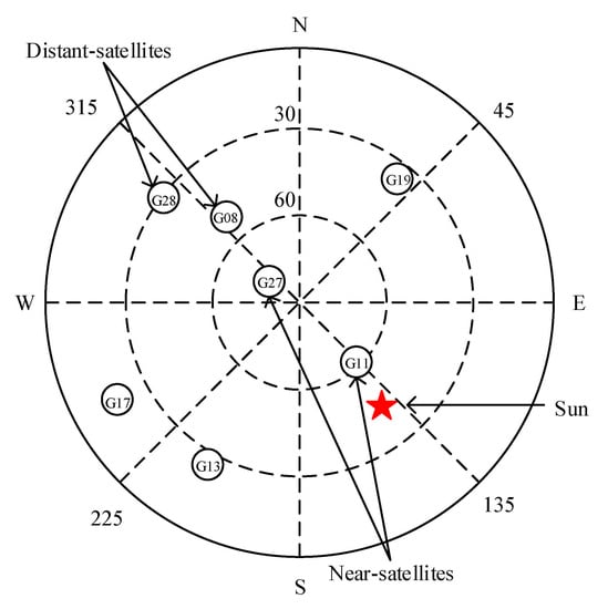 Table 6 lists the azimuth () and elevation () of the Sun and the satellites at 03:30:00 (UTC). Two near-satellites and two distant-satellites are selected for each station.