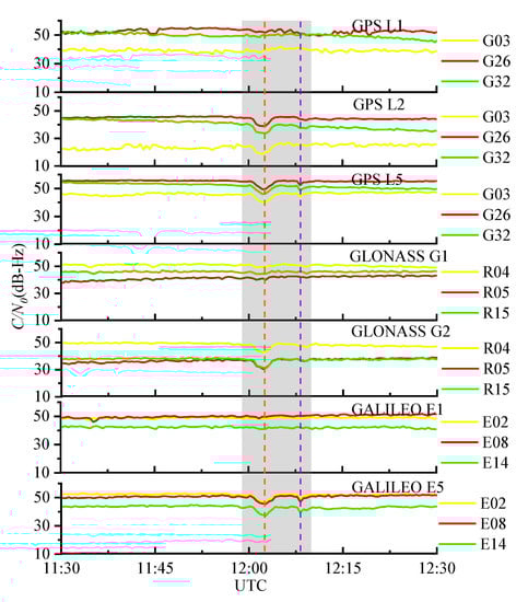 Figure 10 presents the carrier-to-noise ratio observation data of GPS, GLONASS, and Galileo at the HARB station during 11:30:00–12:30:00 (UTC) on 6 September 2017, and the shaded area indicates the period when the SRB occurred. At the time of the peak flux density (12:02:30), the values of GPS L2, GPS L5, GLONASS G2 and Galileo E5 drop sharply by approximately 5–7 dB-Hz. Additionally, there is a slight drop near 12:08:00 (UTC). In each subdiagram of Figure 10, the decline degree of at each satellite appears to be similar at the same frequency. However, the values at various frequencies are affected by the SRB to different extents. The values of the high frequencies of GNSS (GPS L1, GLONASS G1, and Galileo E1) show an inconspicuous decrease, which is consistent with the conclusions of the study in [22]. They also pointed out that a possible reason for this is the different sensibilities of the GNSS frequencies and systems to SRB interference. Accordingly, this phenomenon leads to a difference in the detection rates at different GNSS frequencies in subsequent experiments.