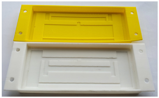 Designing and manufacturing an antenna using a 3D printer presents several benefits such as the 3D shape, which can play the role of the high-gain antenna. The 3D printing allows us to fabricate antennas accurately and easily, and it also allows us to change the antenna structure easily. The 3D printed cavity structures with concave and convex structures of antenna were designed and are shown in Figure 1. The convex (1 mm protrude surface) surface structure is fabricated with yellow PLA, and the concave (1 mm recessed) type antenna is fabricated with white acrylonitrile butadiene styrene (ABS) plastic shown in Figure 1. The regions or areas of conductive parts of antennas are painted with conductive ink, called the convex or concave surface of the inner surface of the cavity structures shown in Figure 1. The height of the concave area is lower than the flat surface, and the height of the convex area is higher than the 3D printed flat surface of the plastic shown in Figure 1.