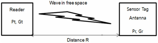 Figure 2 shows the communication in free space between the reader’s transmitting antenna and a sensor tag receiving antenna. The Friss Equation (1) [20,21,22] shows the relation between all parameters involved in the transmission and receiving system. Those parameters are transmitted power , transmission antenna gain , tag antenna received power , gain of reader antenna , wavelength λ and the distance between the transmitting and the receiving antenna R:
